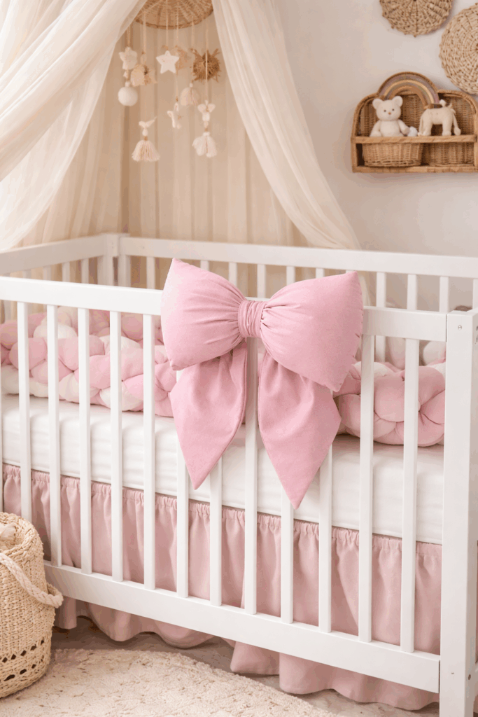 Stylowa, duża kokarda wykonana z miękkiego, przyjemnego w dotyku weluru to wyjątkowy dodatek, który nadaje dziecięcej przestrzeni uroku i subtelnej elegancji. Jej efektowny kształt oraz staranne marszczenie w centralnej części sprawiają, że pięknie się prezentuje i przyciąga wzrok.